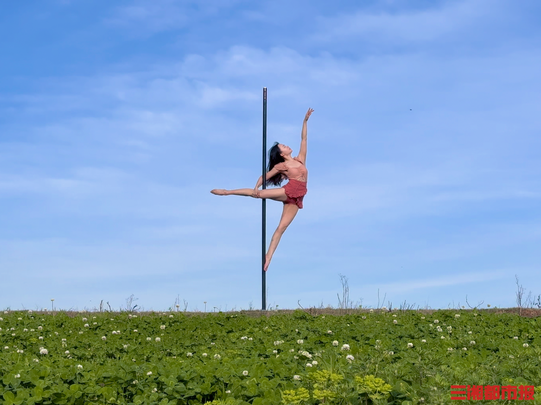 蓝天下,夕阳中,草地上,如同精灵一般随风起舞,自由又美好。来自湖南长沙的严希在草地上跳出了最浪漫的钢管舞。