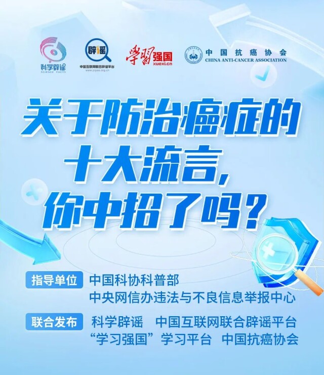 每年的 4 月 15 日~21 日都是全国肿瘤防治宣传周,今年是第 30 届全国肿瘤防治宣传周,主题为“综合施策,科学防癌”。“癌症”是一个让人很纠结的话题。一方面,大家总不愿主动提起,觉得不吉利;另一方面,大家又异常关心、担心和焦虑。也因此,关于癌症预防和筛查,历来是谣言重灾区。今天,科学辟谣联合中国互联网联合辟谣平台、“学习强国”学习平台、中国抗癌协会,针对 10 个广为流传的有关“防治癌症”的流言进行解读,快看看你中招了没?