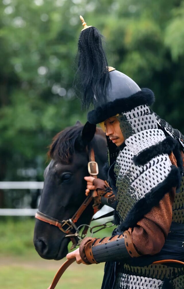 “最难的一套,是根据明代《出警入跸图》的名场面,设计出的元明时期游牧民族风格的甲胄。”谭舟洲描述,通过5000片甲片层层叠加,横排、纵连铆接而成,缝制皮料作为内衬,通过革带相连,整副完成后,重达30公斤,精美绝伦。
