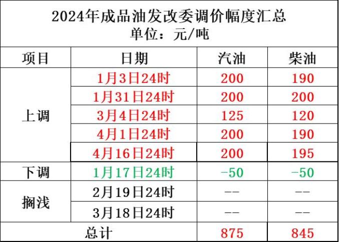 回顾来看,今年以来国内成品油价共经历8次调整,分别是5次上调、1次下调、2次搁浅。其中,仅1月17日汽、柴油小幅下调50元/吨。上调幅度则多次达到200元/吨。8次调整合并计算后,汽、柴油价格较年初分别上涨875元/吨、845元/吨。