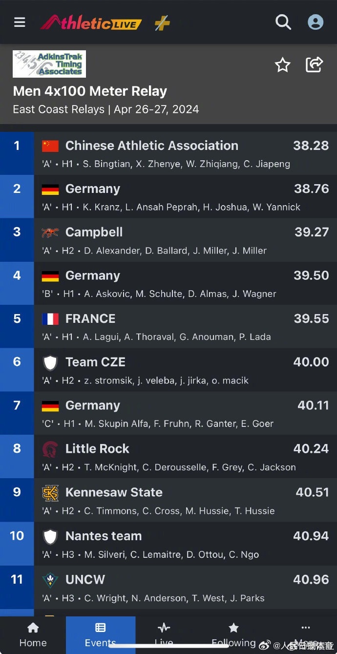 4月28日,中国田径短跑队继续在美国参赛。美国佛罗里达东海岸接力赛男子4X100米,由苏炳添、谢震业、吴智强和陈佳鹏组成的中国接力男队以38秒28夺得冠军。这一成绩比杭州亚运会夺冠成绩38秒29,还要快0.01秒。男子100米飞人大战中,谢震业10秒139获得第四名,苏炳添成绩为10秒50。