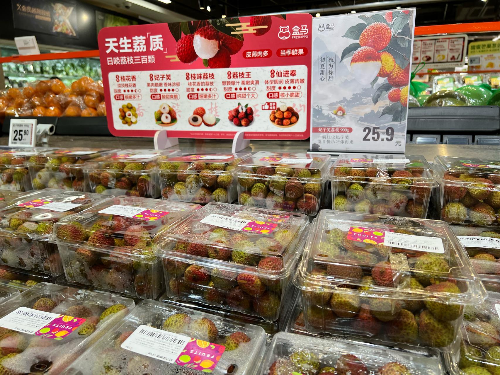 “一个月前我们上的是海南产的早熟品种桂花香。妃子笑虽然今年上市晚,但价格降幅较大。刚上市时价格大概是39.9元450克,现在已经降了一半还不止。目前正是妃子笑大量上市的时候,价格和味道都很好,很受顾客欢迎。25.9元/900克的价格是我们昨天才开始推出的。”盒马喜盈门店店长刘喜雯告诉记者。