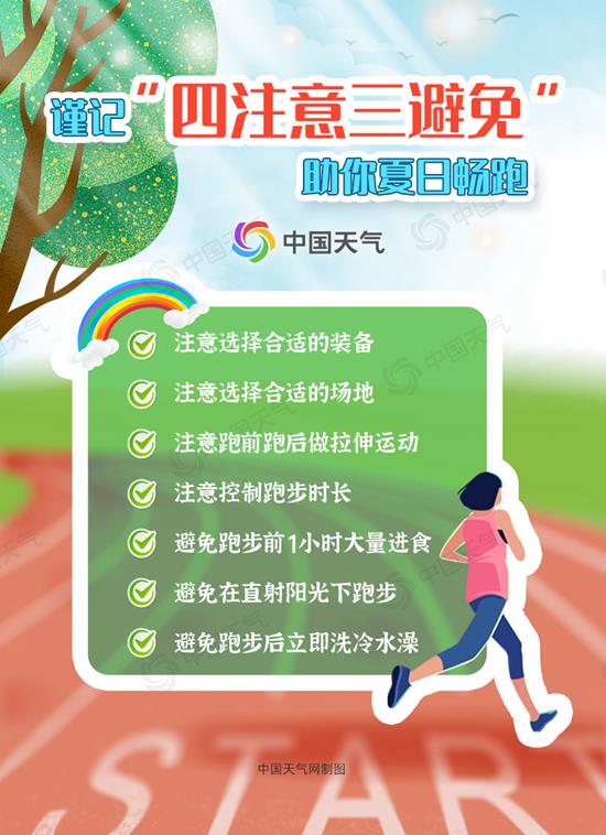 陕西大部、苏皖大部、江汉大部、重庆、江西、湖南以及新疆南部等地虽然午后较热,但早晚气温适宜,大家可以在清晨或晚上太阳落山后跑起来;在广西大部、湖北中东部以及四川、湖南的零星地区,热力十足,最低气温也在24℃以上,如果想要户外跑,清晨可能稍微凉快一些,外出锻炼一点要注意及时补充水分,必要时选择一些功能饮料,既能补水又能身体补充能量。