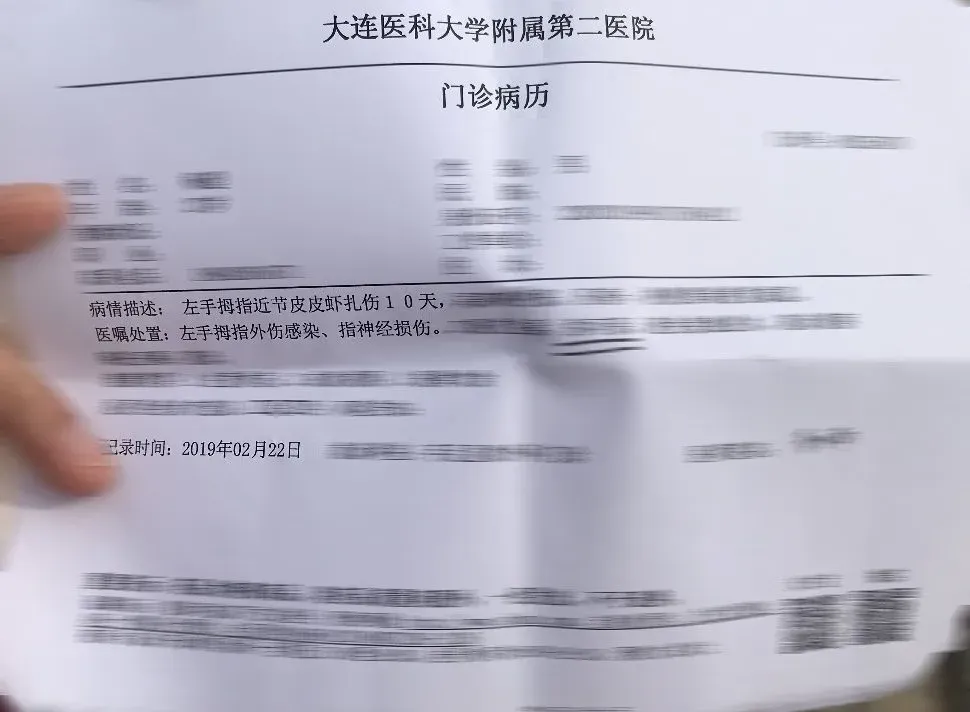 在被皮皮虾击穿 10 天之后,拇指依然是麻木的,于是笔者去了医院。在其他患者 “你咋还能让那玩意给打了” 的嘲笑声中,医生给出了诊断:左手拇指外伤感染,指神经损伤。
