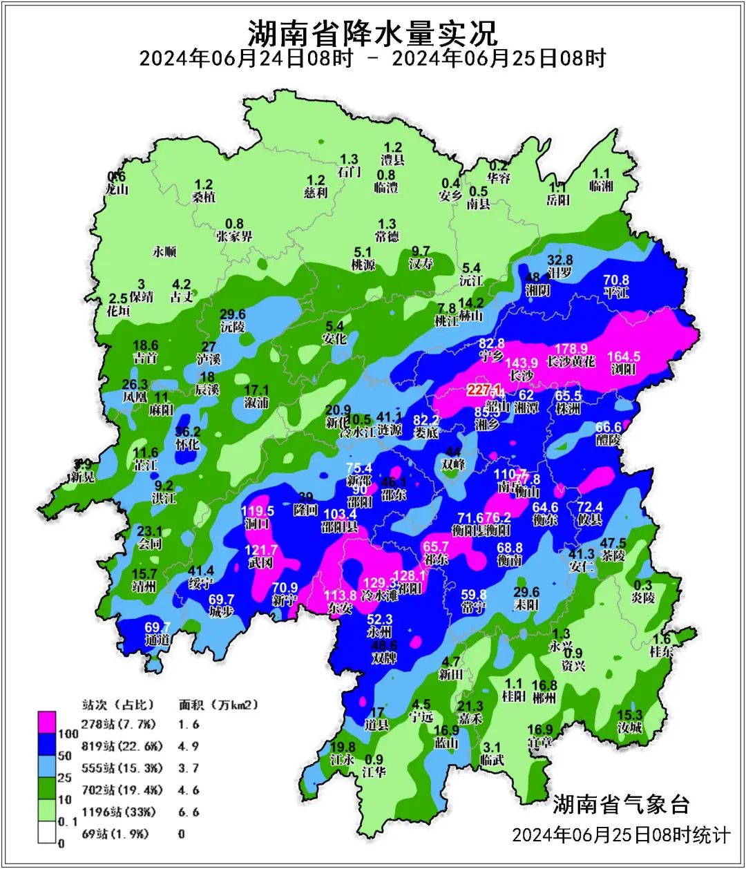 昨天08时至今天08时,全省平均降水量36.1毫米,其中长沙101.6毫米,湘潭85.2毫米,衡阳60.3毫米,湘潭、长沙、株洲等11市(州)72县(市、区)641乡(镇)累计雨量超过50毫米,湘潭、长沙等9市(州)40县(市、区)193乡(镇)超过100毫米,湘潭(韶山、湘乡)、长沙(长沙县、宁乡、雨花区)2市(州)5县(市、区)9乡(镇)超过200毫米,最大为韶山杨林乡227.1毫米,小时雨强最大为洞口茶铺茶场93.5毫米(24日17时至18时)。