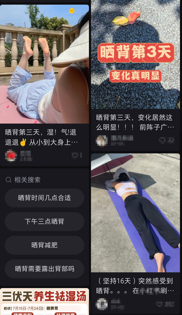 发现了吗?夏天一到,大家最关心的莫过于减肥瘦身,而三伏天更是在社交媒体平台上被冠以“减肥黄金期”“掉秤最快的40天”等名号,“晒背”等方法被很多人推崇为三伏天养生、减肥的手段。