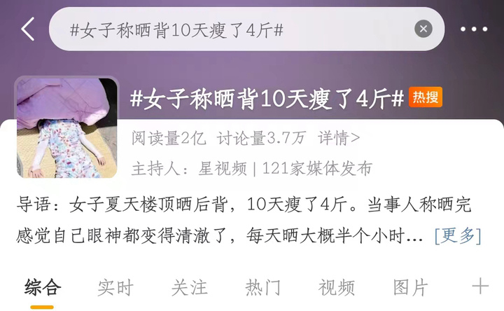 近日,“女子称晒背10天瘦了4斤”的消息冲上热搜,引发多方关注,阅读量达到2亿。