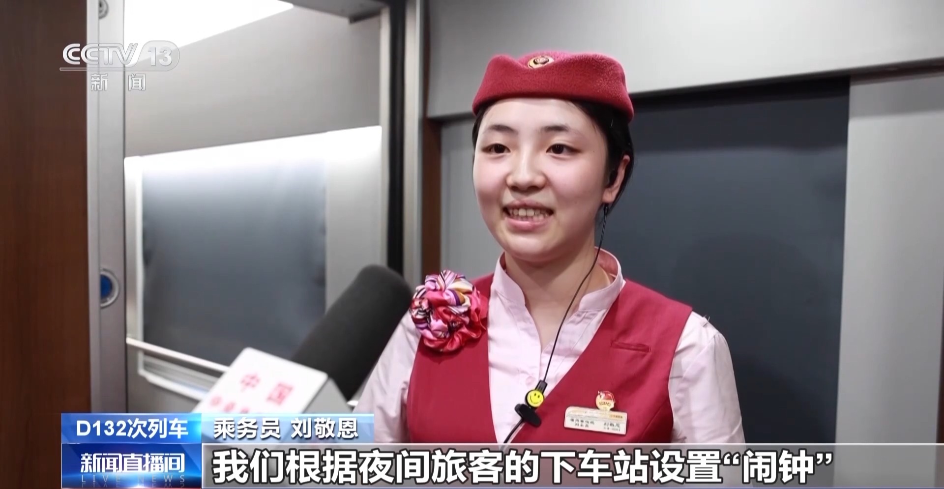 乘务员 刘敬恩:为了避免夜间旅客睡过头,我们根据夜间旅客的下车站设置“闹钟”,在旅客到站前提醒旅客做好下车准备;为避免旅客夜间辨识不清,拿错行李,我们还在旅客的行李上粘贴到站辨识标签,方便旅客辨认。