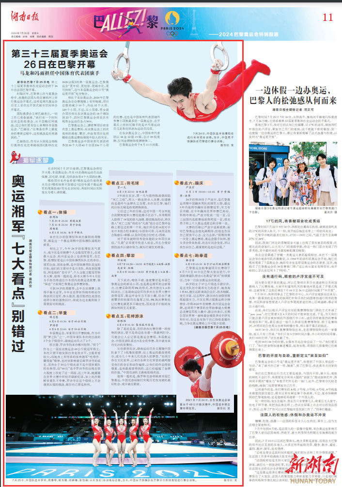 北京时间7月27日凌晨,巴黎奥运会将拉开大幕。本届奥运会,共有15名湖南运动员将出战体操、羽毛球、举重、花样游泳等8个大项的比赛。