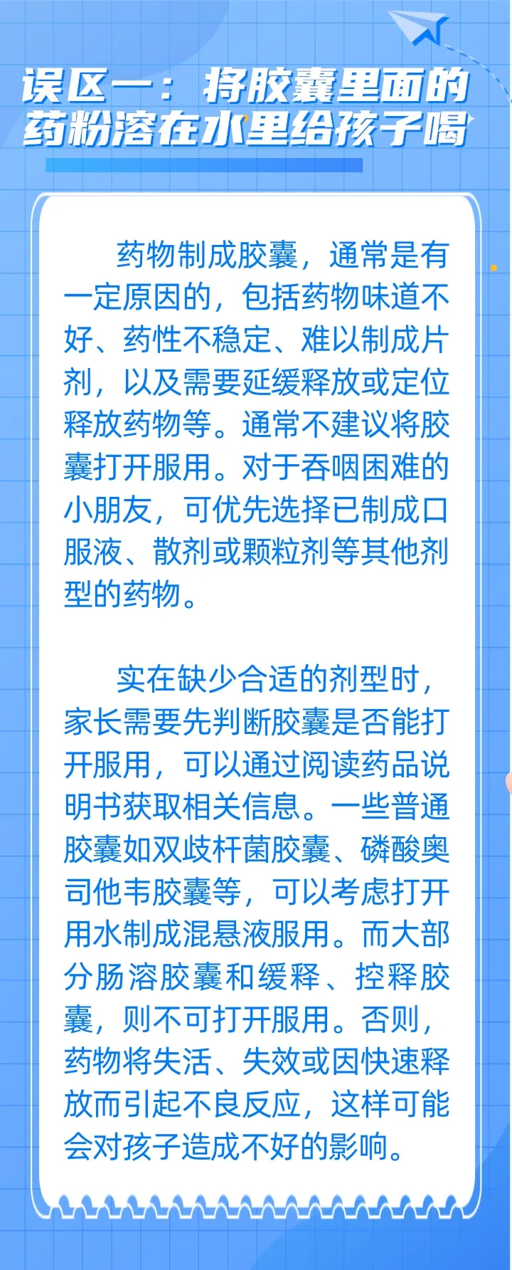 家长在给孩子吃药前,还要仔细查看药品说明书。如果说明书里提到“整片吞服”或“不可掰开或碾碎”等,那就不能掰开服用。