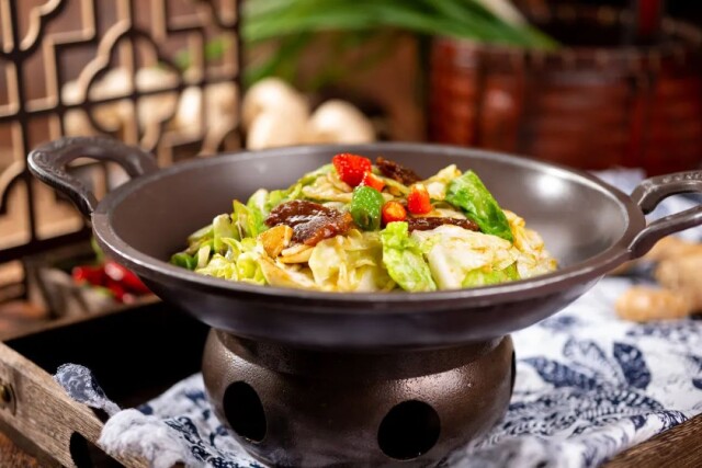 干锅菜和干煸菜有异曲同工之妙。所谓干锅,是指先将腌制好的食材,用大火、重油(常用猪油或用五花肉煸炒出油)煸炒至部分水分蒸发,使食材表面呈现出干香、酥脆的口感。然后再放入各类调味料,继续煸炒,使食材充分吸收香味。最后将炒好的食材放入干锅中,底部用明火持续加热,让菜肴在食用过程中保持温度和风味。