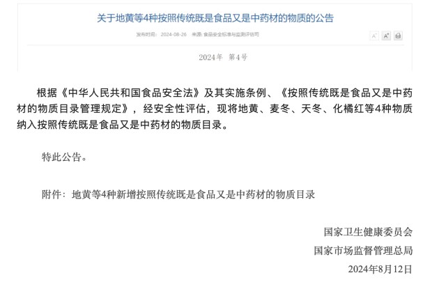 “食药同源”的中药材,您对其了解多少?8月26日,国家卫生健康委员会、国家市场监督管理总局联合“官宣”,根据《中华人民共和国食品安全法》及其实施条例、《按照传统既是食品又是中药材的物质目录管理规定》,经安全性评估,正式将地黄、麦冬、天冬、化橘红等4种物质纳入按照传统既是食品又是中药材的物质目录。