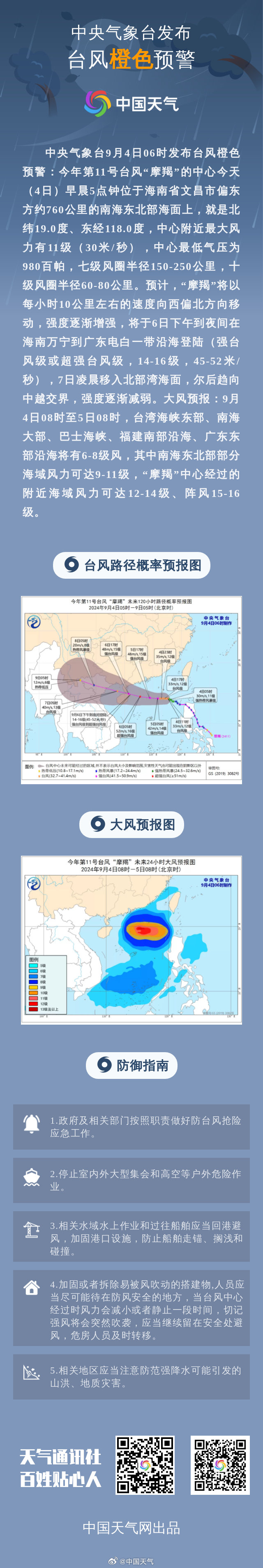 中央气象台9月4日06时发布台风橙色预警:今年第11号台风“摩羯”的中心今天(4日)早晨5点钟位于海南省文昌市偏东方约760公里的南海东北部海面上,就是北纬19.0度、东经118.0度,中心附近最大风力有11级(30米/秒),中心最低气压为980百帕。