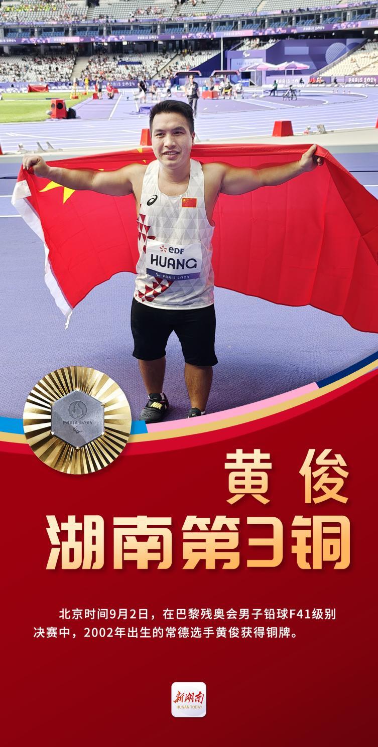 北京时间9月2日,在巴黎残奥会男子铅球F41级别决赛中,2002年出生的常德选手黄俊,以11米66的成绩夺得了铜牌,为湖南省田径投掷队赢得了第一枚残奥会奖牌。