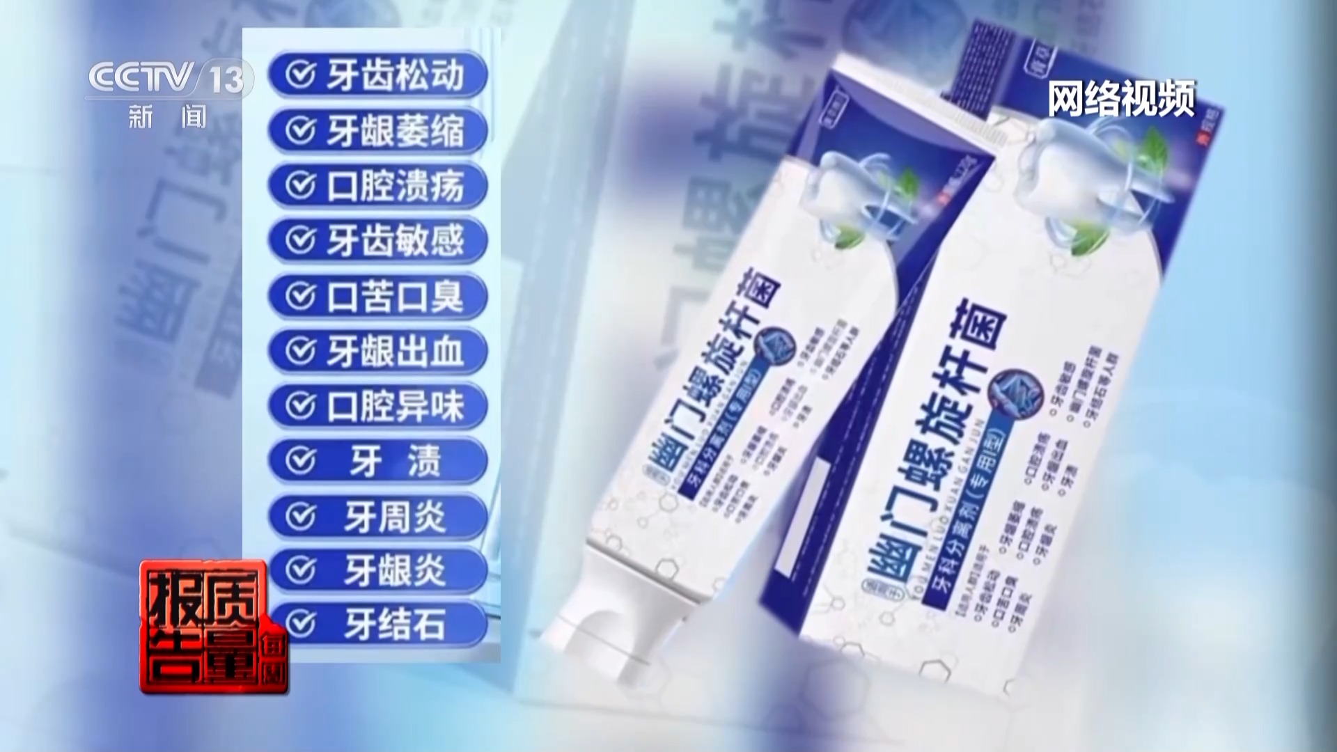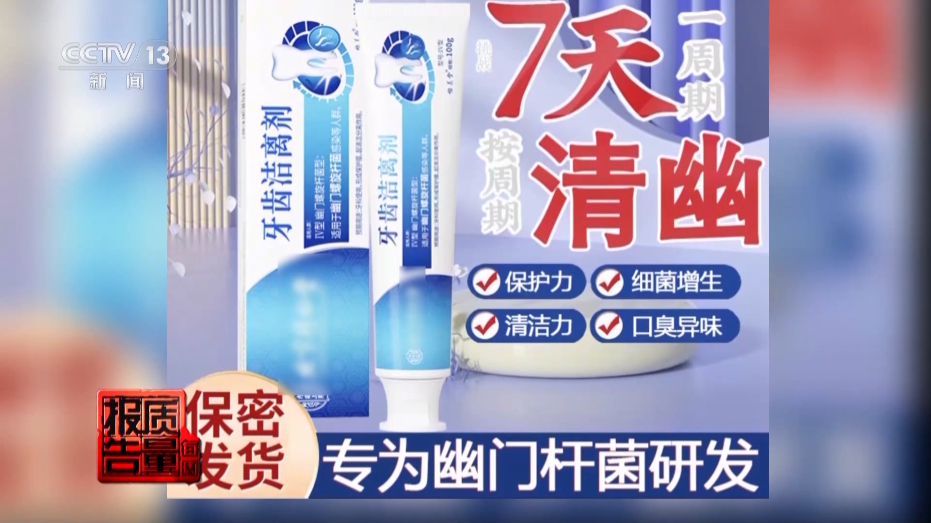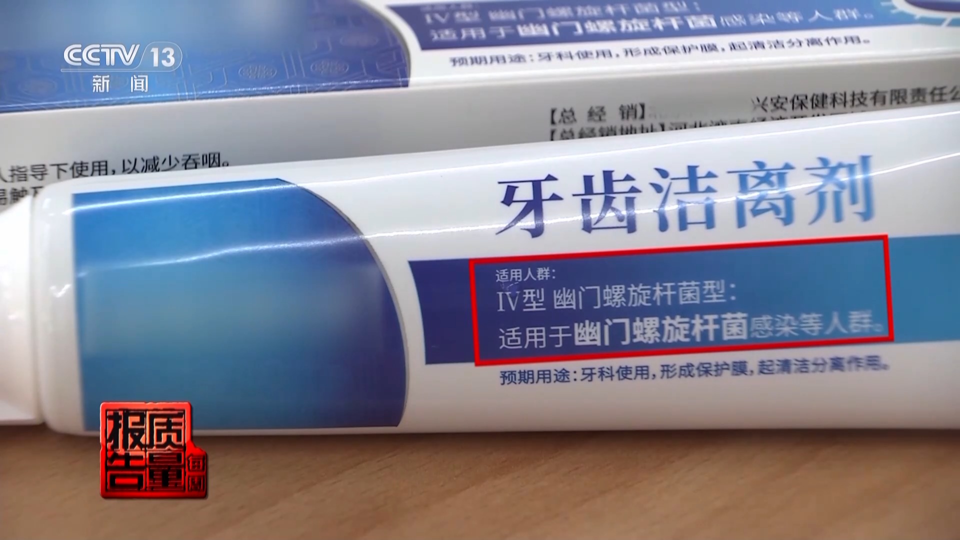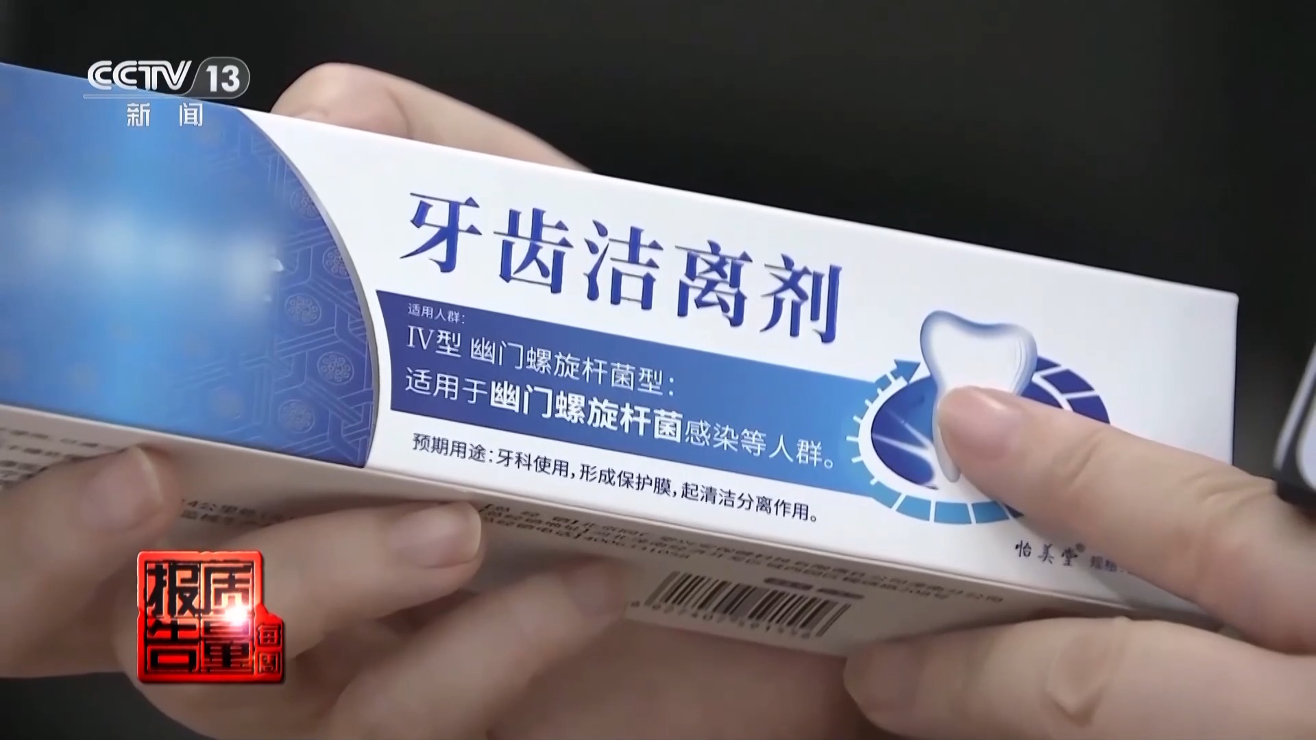 总台央视记者苍丽莉:我现在手里拿的就是前两天在网上订购的宣称专为幽门杆菌研发的牙膏。我们看到这个产品的外包装上,写着牙齿洁离剂几个字,包装上并没有牙膏的字样。在这个地方我们可以清楚地看到,标着械字号,也就是说,这属于一款医疗器械产品,它并不是普通的牙膏。