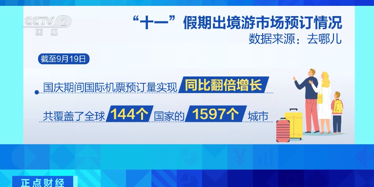 记者了解到,随着“十一”假期到来,国内和出境长线旅游市场都迎来了迅猛增长。旅游预订平台数据显示,截至9月19日,国庆期间的国际机票预订量已经实现了同比翻倍增长,共覆盖了全球144个国家的1597个城市,其中,三线及以下城市居民的预订量同比增长了2.5倍。此外,多样的文化活动如艺术展览、音乐会等,吸引着众多中国游客。在民宿预订平台上,具有“葡萄园”“城堡”“农场”等特色的住宿备受欢迎。
