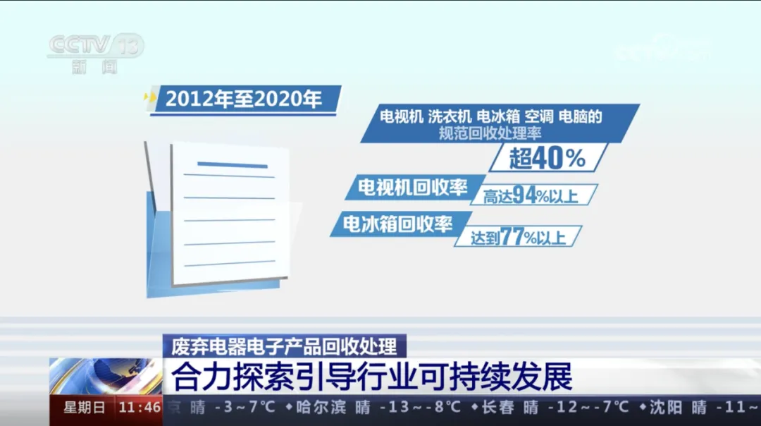 生态环境部发布的《中国电子废物环境综合管理(2012-2021)》显示,从2012年开始,国家通过发放基金等方式,引导电器回收行业发展,时至今日已经取得了一定成效:电视机回收率高达94%以上,电冰箱回收率达到77%以上。