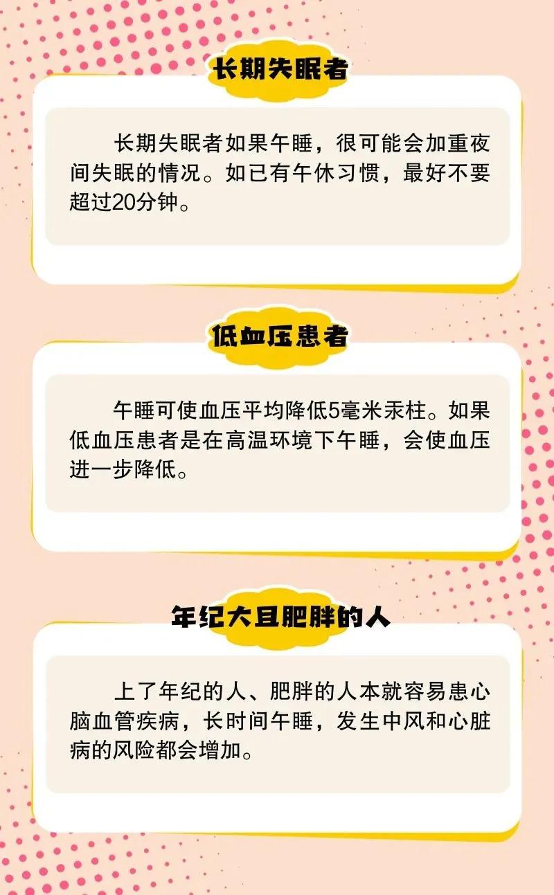 2023年4月,《肥胖》(Obesity)杂志发表了一项研究显示,与不午睡的参与者相比,长时间午睡(大于30分钟)的人,体质量指数(BMI)、腰围、空腹血糖、收缩压、舒张压、代谢综合征患病风险等相关数值都更高;短时间午睡(小于30分钟)的人则在血压方面表现更好。