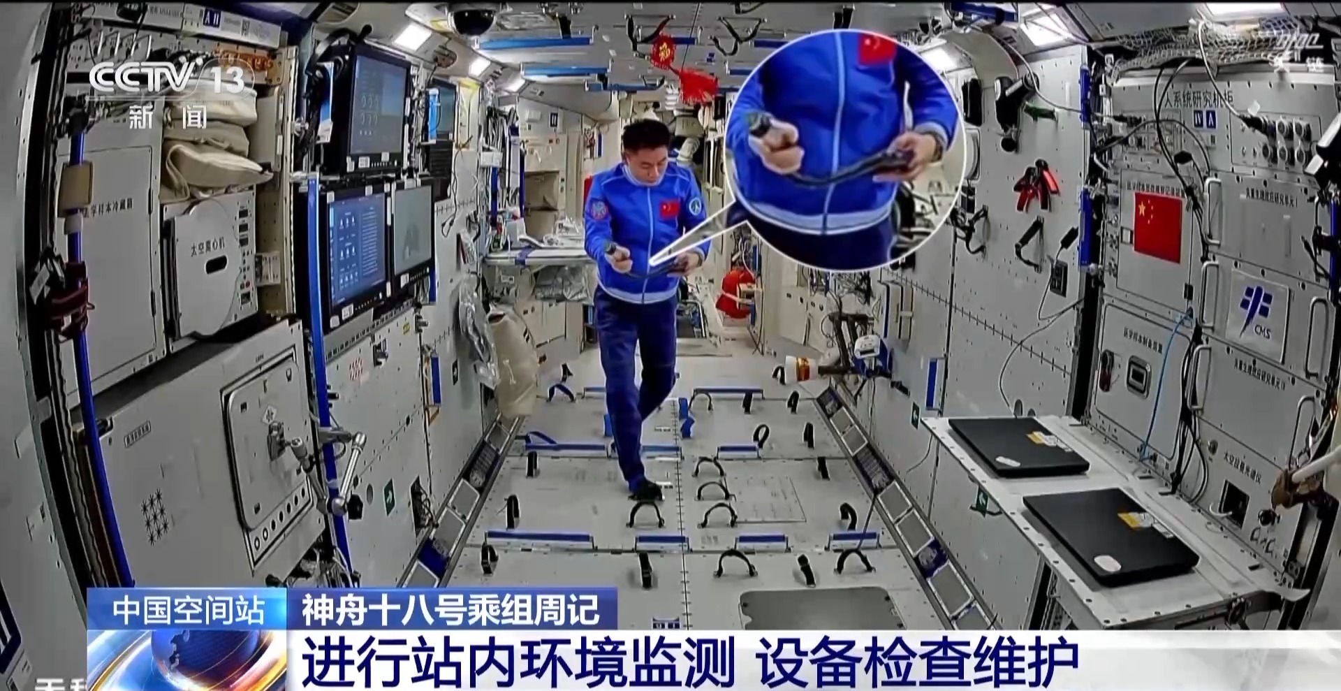 为保证空间站舱内环境适宜,设备稳定运行,需要定期开展环境监测与设备检查维护工作,乘组使用相关设备进行了个人噪声暴露剂量测量,并完成数据导出与下传工作。同时,通过开展空气洁净度测试、风速及温度测量,监测颗粒物水平以及空气流速、温度。