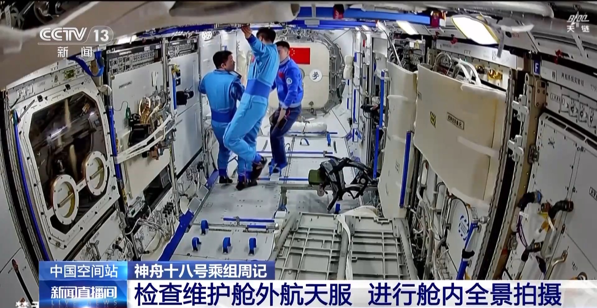 上周,乘组开展了空间站内“飞天”舱外航天服的定期检查、维护,以及贮存状态设置等工作。舱外航天服是航天员出舱活动时使用的个体防护装备,相当于小型载人航天器,用于生命和作业保障。中国空间站内现有三套舱外航天服,在此次飞行任务期间,已保障乘组圆满完成两次出舱活动。