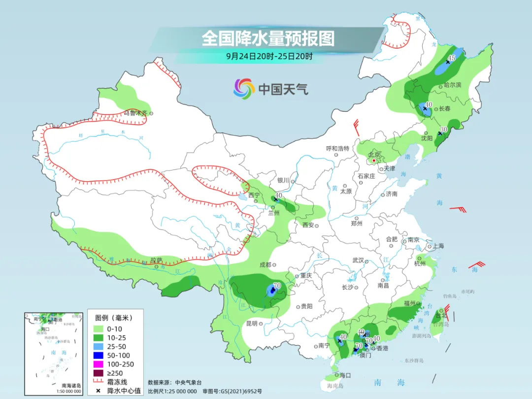 相对来说,未来三天北方大多是秋高气爽的好天气。只是24日至25日,由于有弱冷空气前来打扰,华北北部、东北等地将自西向东出现一次降雨过程,好在降雨匆匆而过,以小雨为主。
