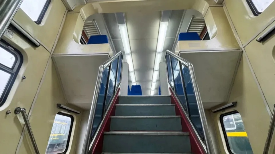 其拍摄的照片显示,列车外部车身蓝白相间,上下两层均设有独立车窗,车厢内部设有楼梯连接上下两层。