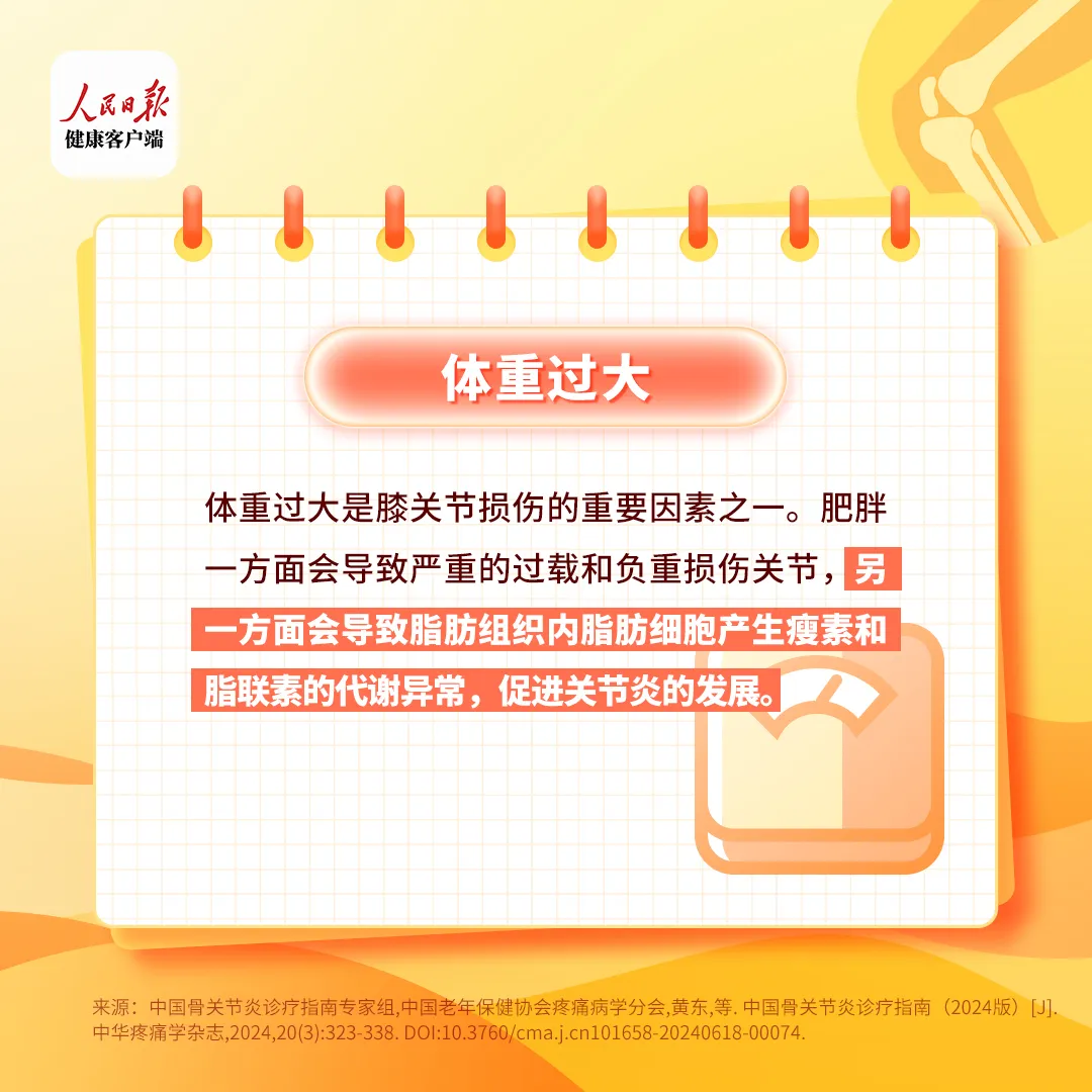 体重过大是膝关节损伤的重要因素之一。肥胖一方面会导致严重的过载和负重损伤关节,另一方面会导致脂肪组织内脂肪细胞产生瘦素和脂联素的代谢异常,促进关节炎的发展。