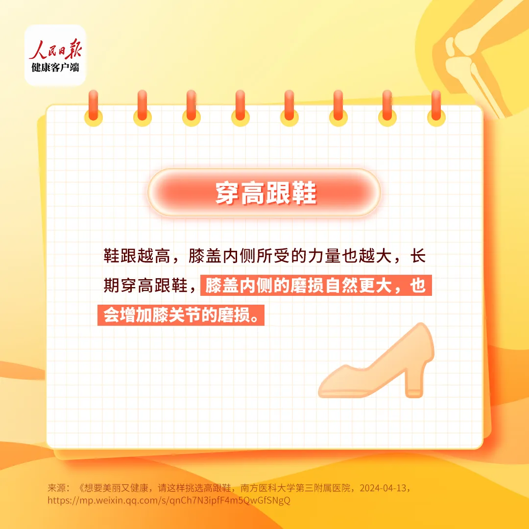 鞋跟越高,膝盖内侧所受的力量也越大,长期穿高跟鞋,膝盖内侧的磨损自然更大,也会增加膝关节的磨损。