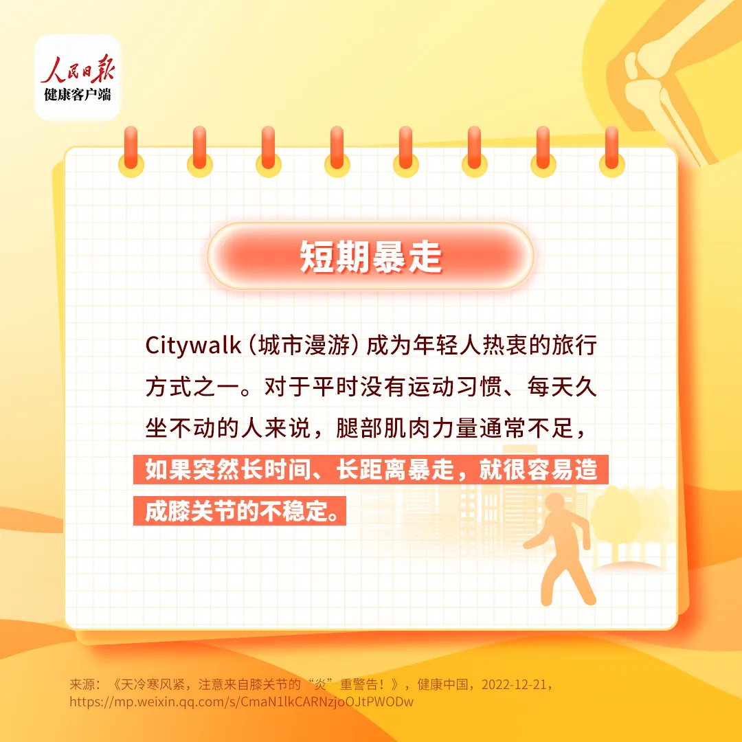 对于平时没有运动习惯、每天久坐不动的人来说,腿部肌肉力量通常不足,如果突然长时间、长距离暴走,就很容易造成膝关节的不稳定。