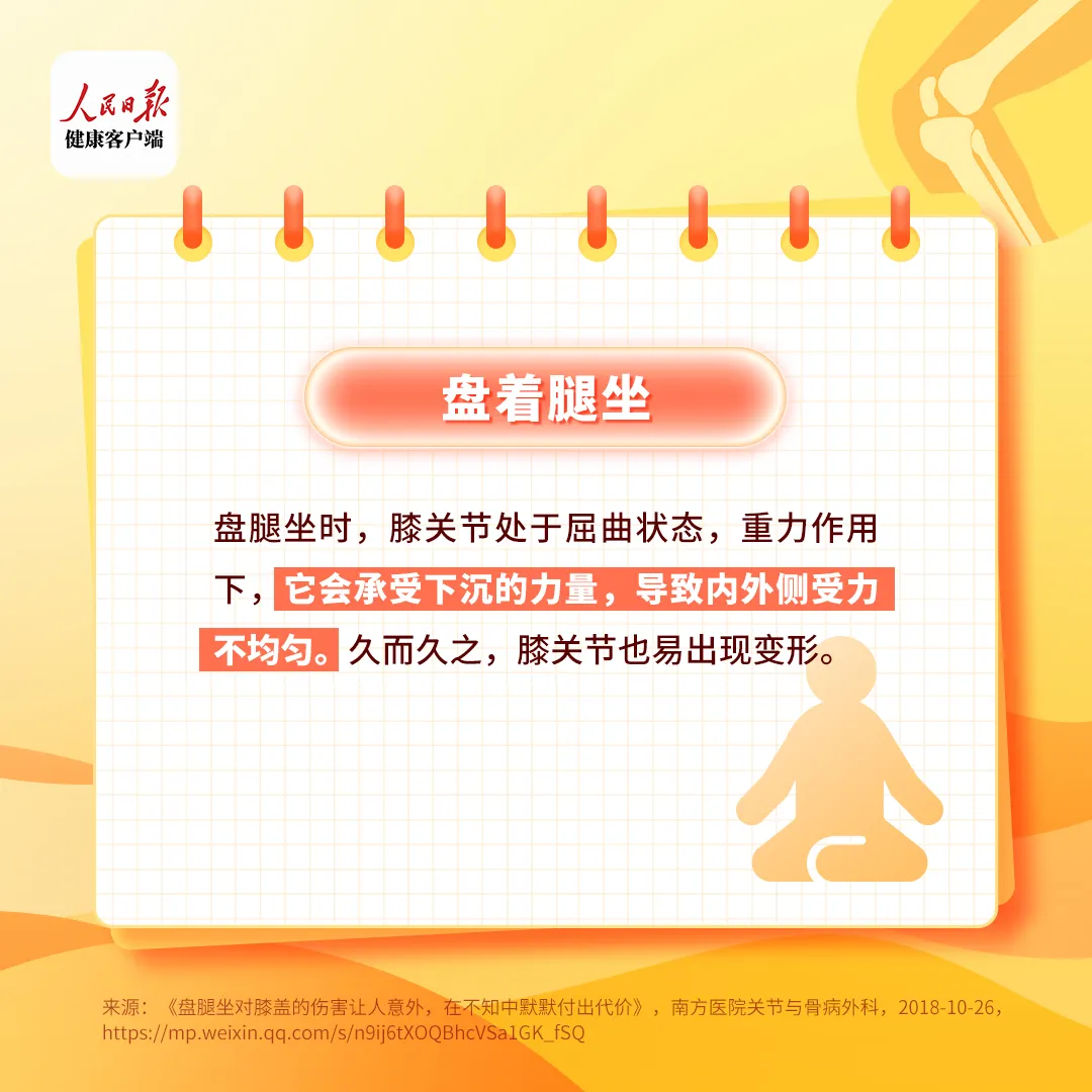盘腿坐时,膝关节处于屈曲状态,重力作用下,它会承受下沉的力量,导致内外侧受力不均匀。久而久之,膝关节也易出现变形。