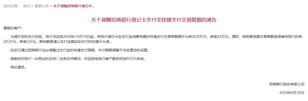 9月30日,招商银行发文称,决定自2024年10月10日起,将招商银行借记卡在支付宝消费场景的快捷支付交易限额提升为单日20万元、单笔20万元。理财、转账等场景交易限额继续维持现行的单日5万元、单笔5万元。具体额度请以支付宝侧实际支付时的展示为准。