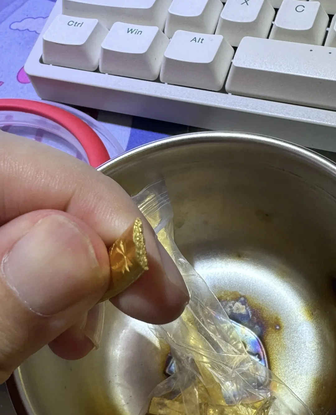 ▲彭佳的手镯剪开后流出液体,液体排空后,手镯重量缩水。受访者供图