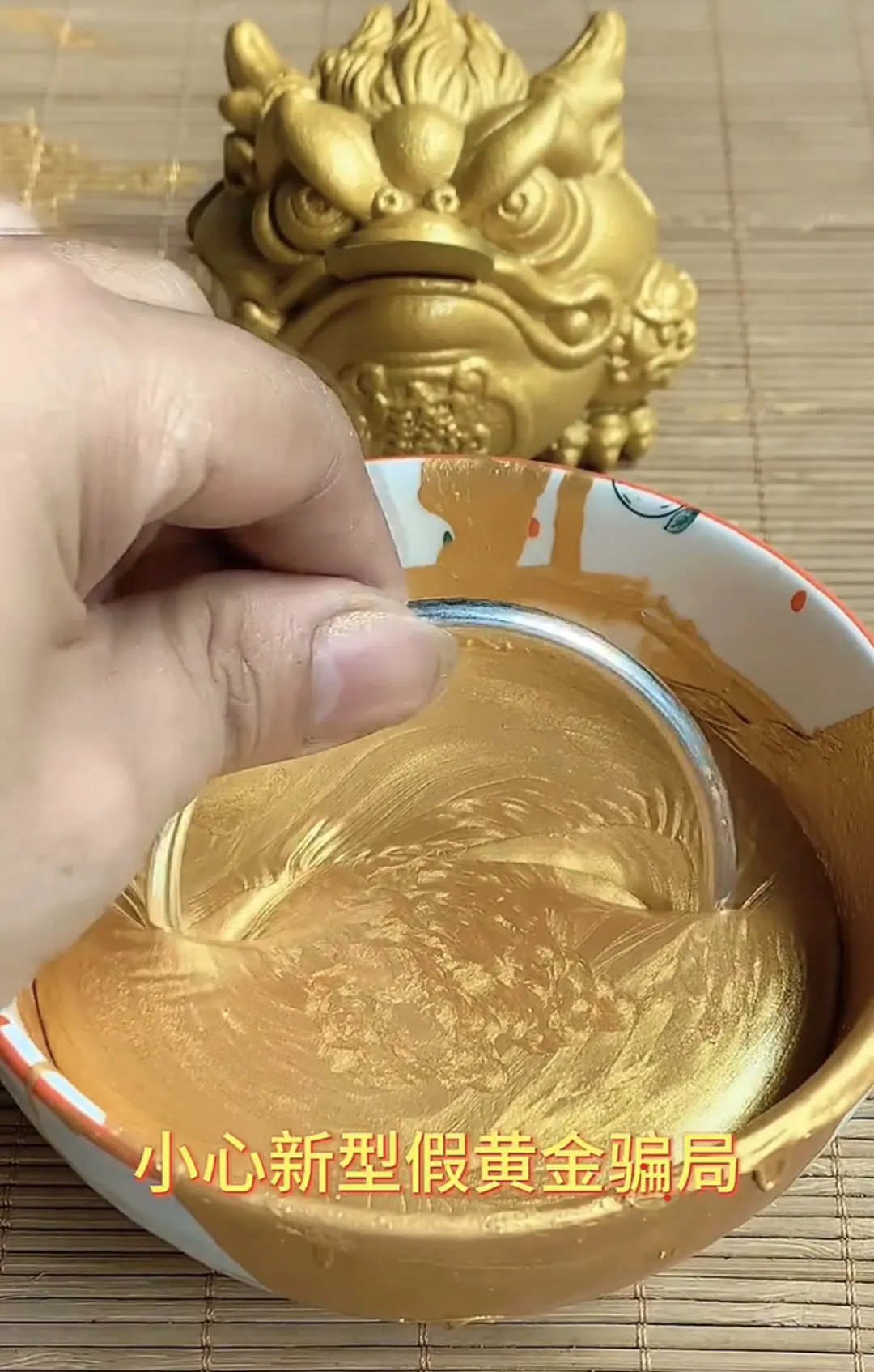 除了直接售卖“假黄金”,一些商家还打着“揭秘假黄金骗局”的幌子,借由各种检验黄金的土方法介绍新型仿金材质的神奇之处:“这种假黄金切开里面也是金色的,放水里秒沉,吸铁石吸不住,水洗不掉色、不过敏”,“持续加热后熔化成金水,过水后又变为金黄色。”