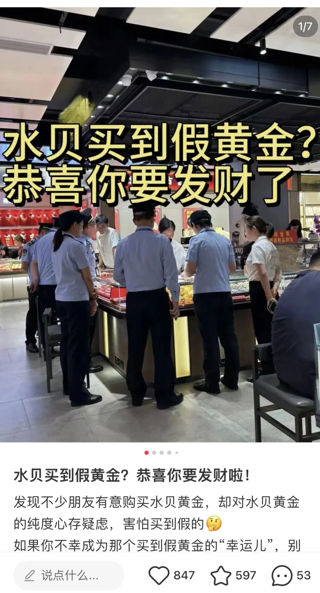 ▲不少商家通过发布“水贝买到假黄金?恭喜你要发财啦!”的宣传语吸引顾客,并以此打消顾客顾虑。图片来自网络