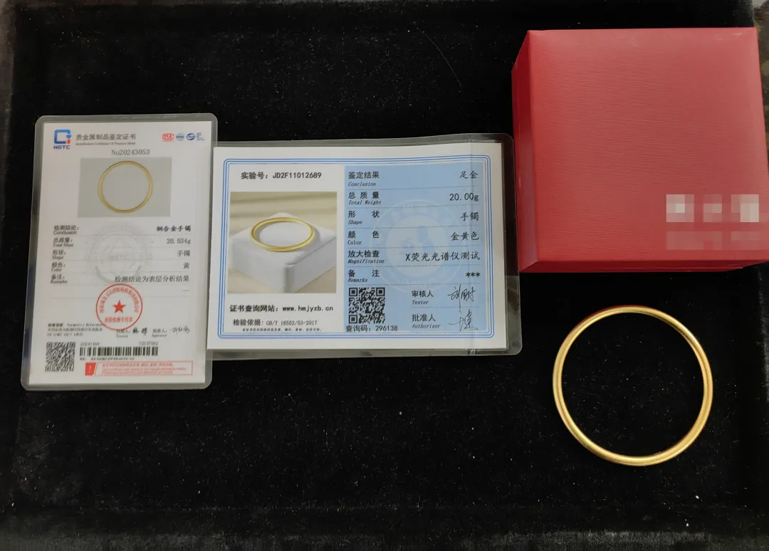 卖家自称用“孟加拉赤金”制成的手镯究竟是什么材质?新京报记者将手镯送到NGTC进行鉴定,工作人员称,对于个人委托人送检样品,只做表层检测,检测结论为铜合金手镯。
