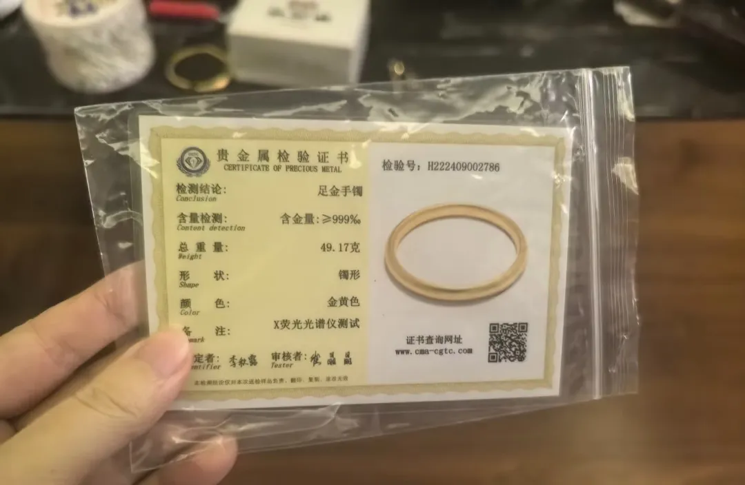 省下一大笔钱的彭佳并不放心。深圳水贝有大大小小上百家检测机构,她交了25元检测费,将手镯送检,大约1小时后,她拿到了检测结果:手镯含金量大于或等于999‰,克重为49.17克,误差在0.01克以内。彭佳这才放心,相信自己真的“薅到了羊毛”。