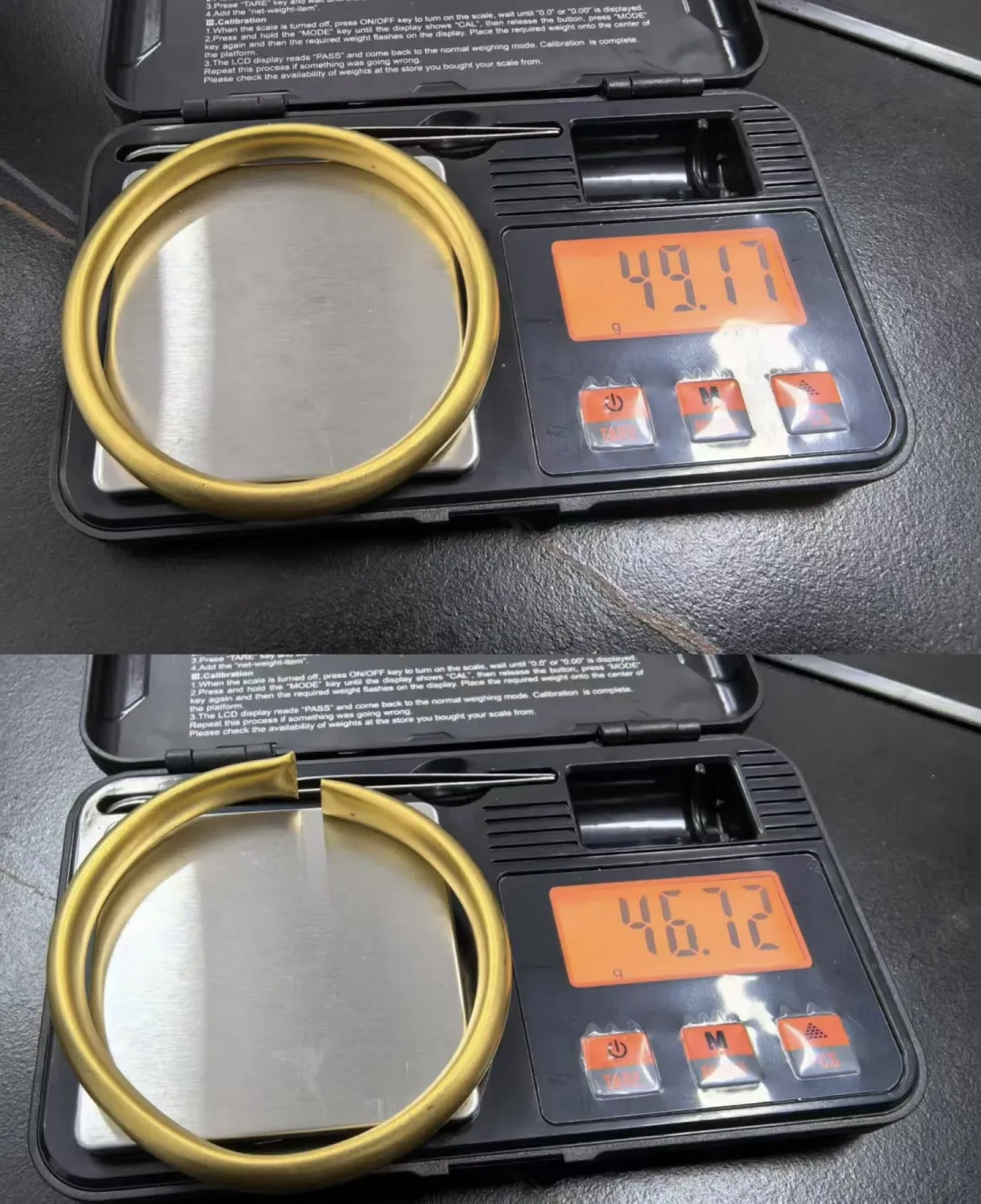 买镯子后一个月,因为金价持续走高,再加上第一次购买非品牌黄金首饰心里不安,她将这只手镯送往一家奢侈品回收店,希望能卖个好价格。当工作人员剪开手镯的一瞬间,彭佳懵了:手镯内流出了疑似是水的透明液体,排空液体后,手镯“缩水”2.51克,按当时的黄金回收价格(617元每克)计算,彭佳损失约1500元。黄金回收工作人员告诉她,她在水贝做的检测只能检测饰品表面含金量,“骗骗外行。”