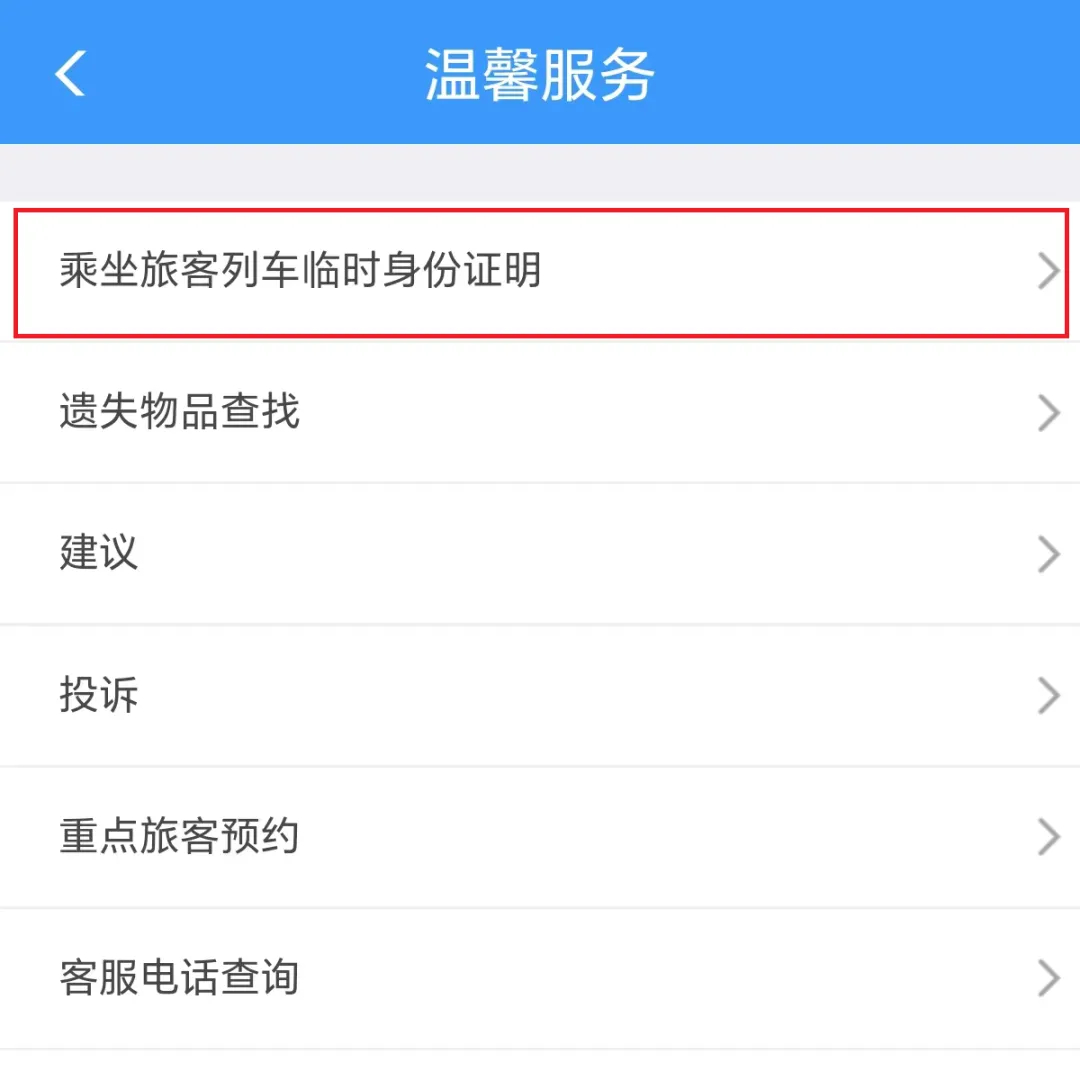 在铁路12306APP首页点击“温馨服务”,即可办理电子临时乘车身份证明。