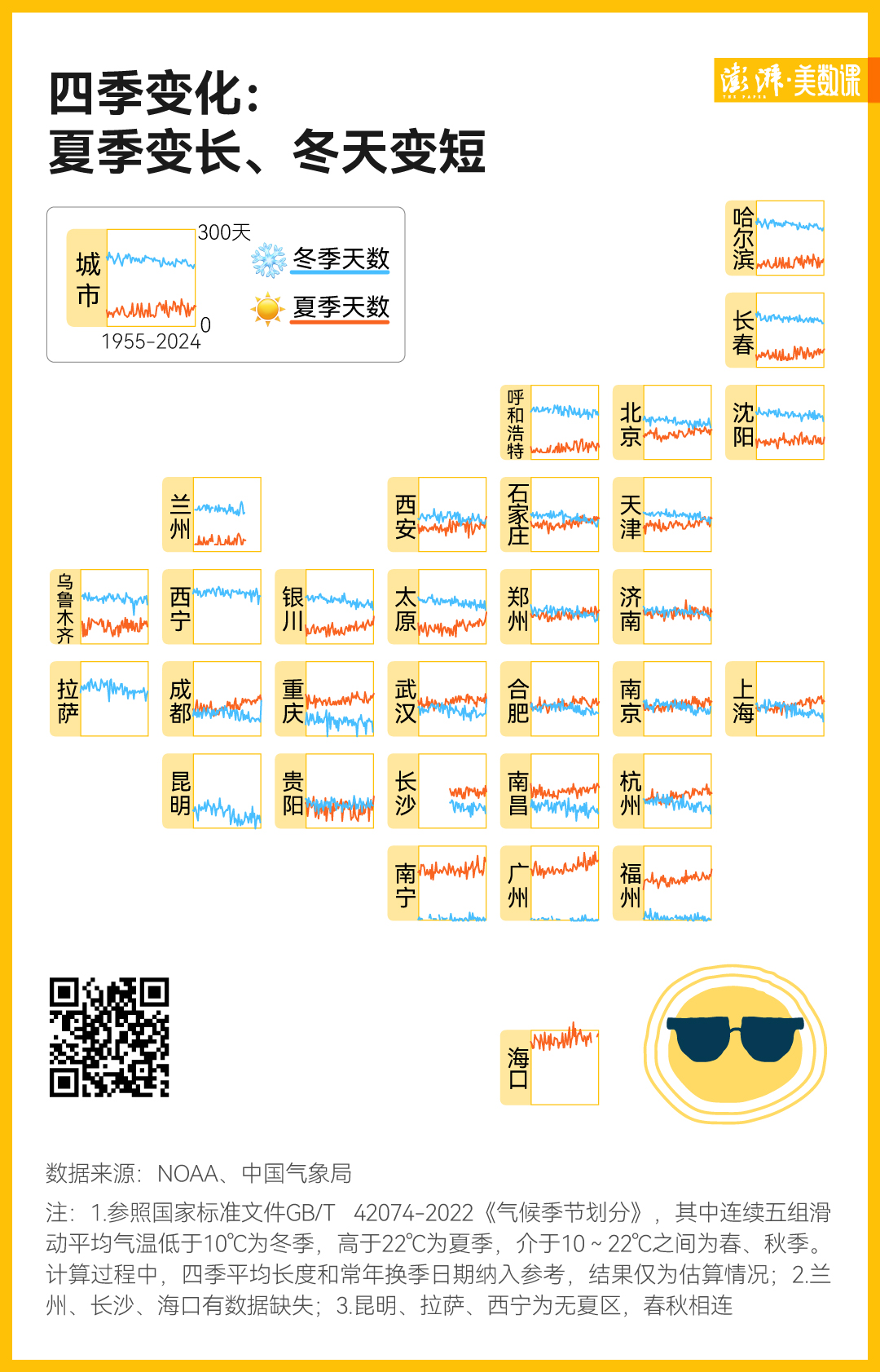 澎湃美数课参照最新2022年的气象行业标准《气候季节划分》,估算了1955-2024年间我国31个省会城市(不含港澳台)的四季长度,试图回答秋天真的在变短和推迟吗?