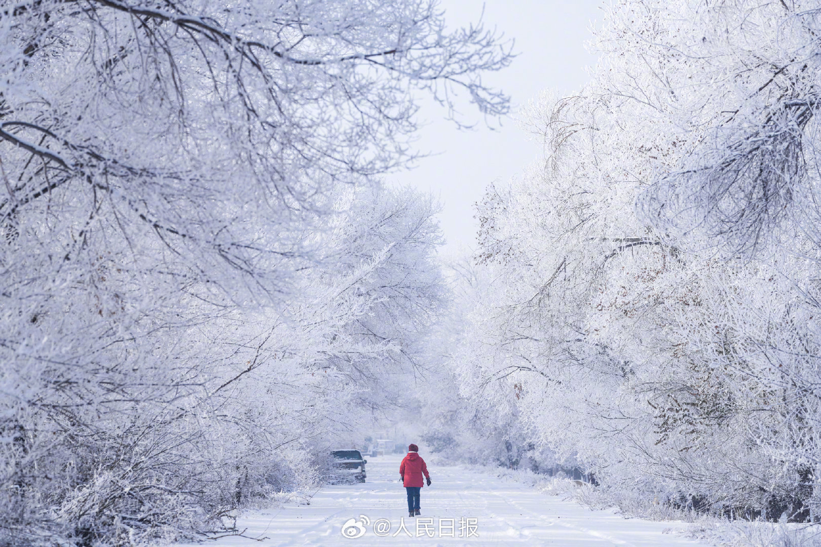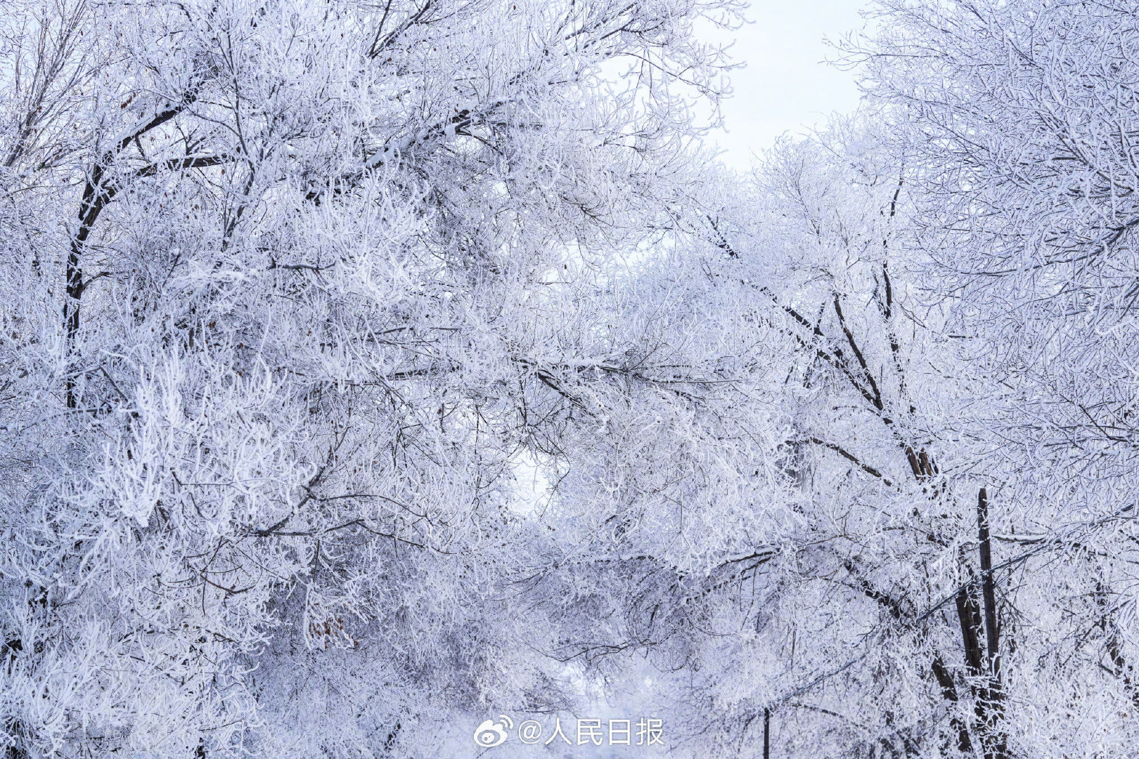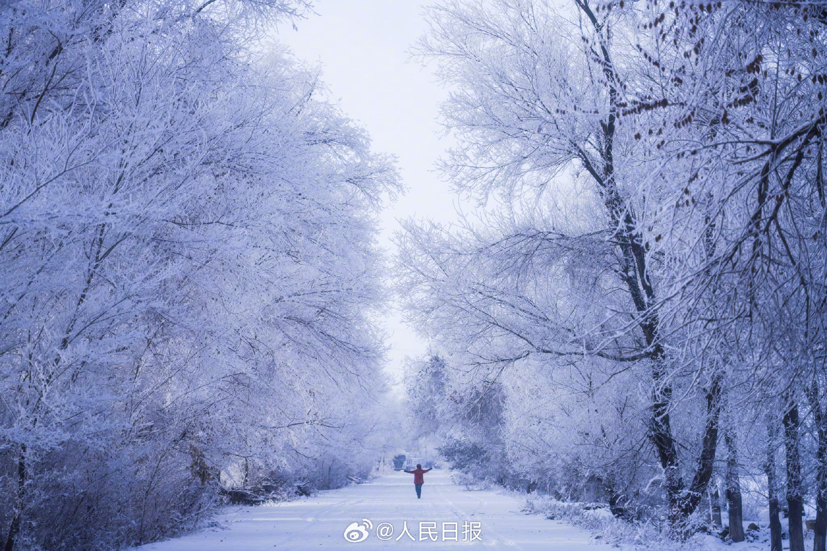11月30日,新疆昌吉州。随着低温和昼夜温差的变化,在郊区一处林荫道,出现了大范围的雾凇景观。网友:雾凇美景真的好像童话世界!