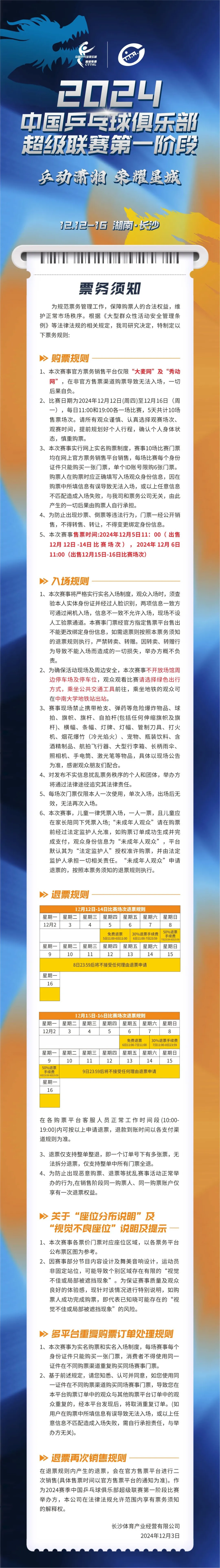 2024赛季中国乒乓球俱乐部超级联赛第一阶段赛事门票销售将于12月5日11时正式在大麦网、秀动网同步开启。