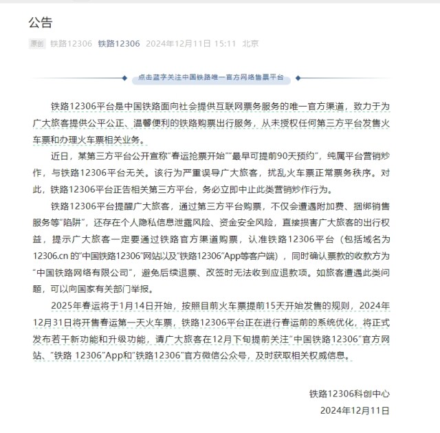 公告表示,铁路12306平台是中国铁路面向社会提供互联网票务服务的唯一官方渠道,致力于为广大旅客提供公平公正、温馨便利的铁路购票出行服务,从未授权任何第三方平台发售火车票和办理火车票相关业务。