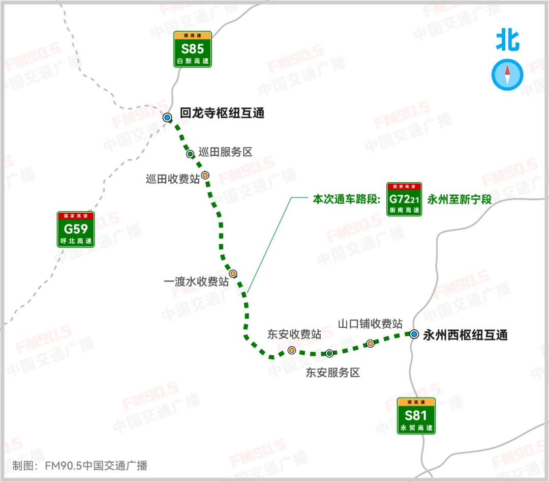 本次通车路段起于湖南永州市东安县井头圩镇浸马塘,通过永州西枢纽互通与S81永贺高速永州至零陵段相接,终点设回龙寺枢纽互通与S85白新高速以及在建的G59呼北高速新化至新宁段高速项目交会。项目主线全长64.413公里,路基宽度26米,采用双向四车道高速公路标准建设,设计时速为100公里,全线共设桥梁60座,设置永州西、山口铺、东安、一渡水、巡田、回龙寺6处互通立交,山口铺、东安、一渡水、巡田4处匝道收费站,东安、巡田2处服务区。