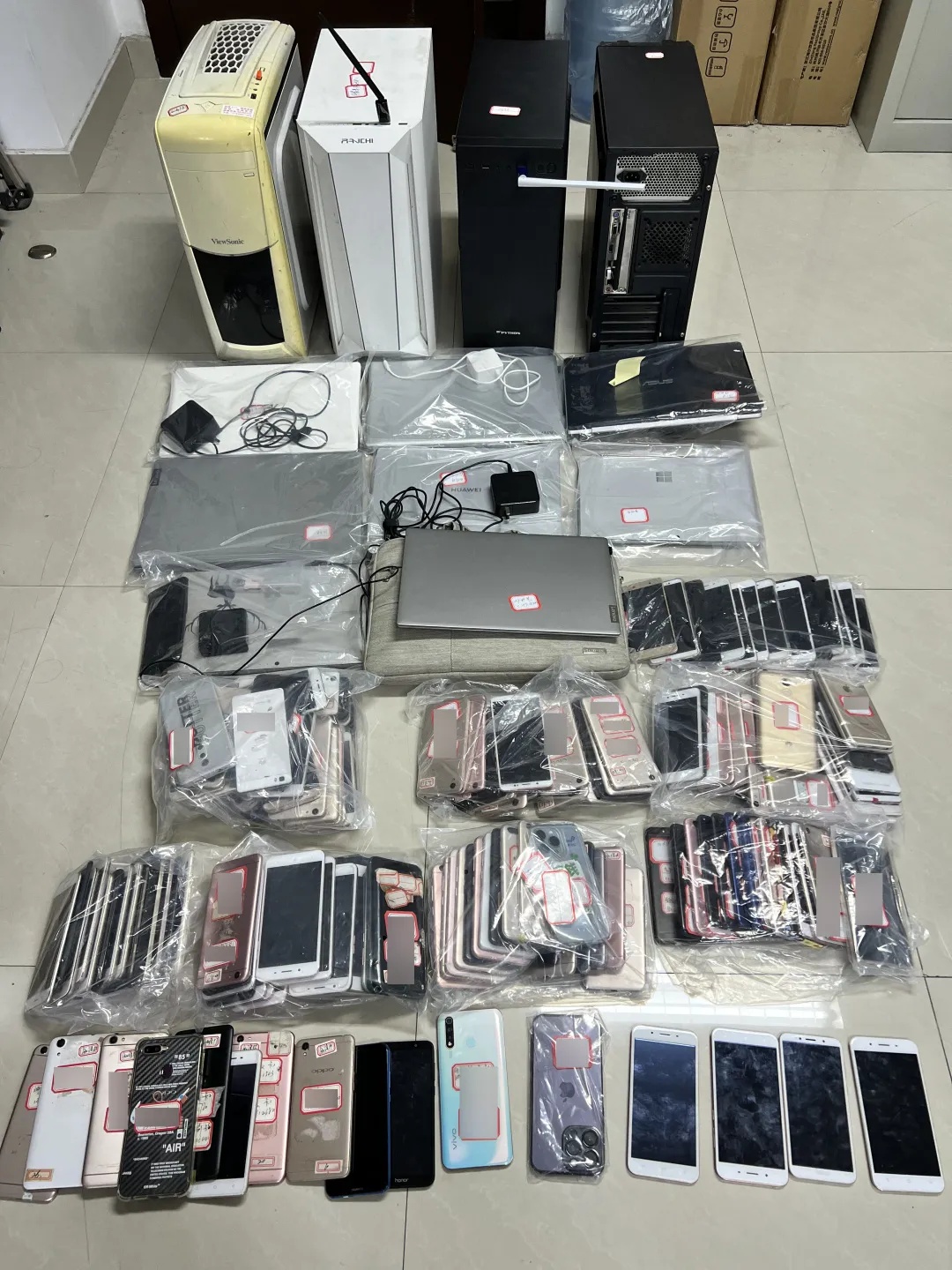 掌握相关证据后,公安网安部门立刻组织精干警力奔赴相关地市,成功抓获以金某为首的犯罪团伙成员33名,现场扣押作案手机200余部、电脑14台。
