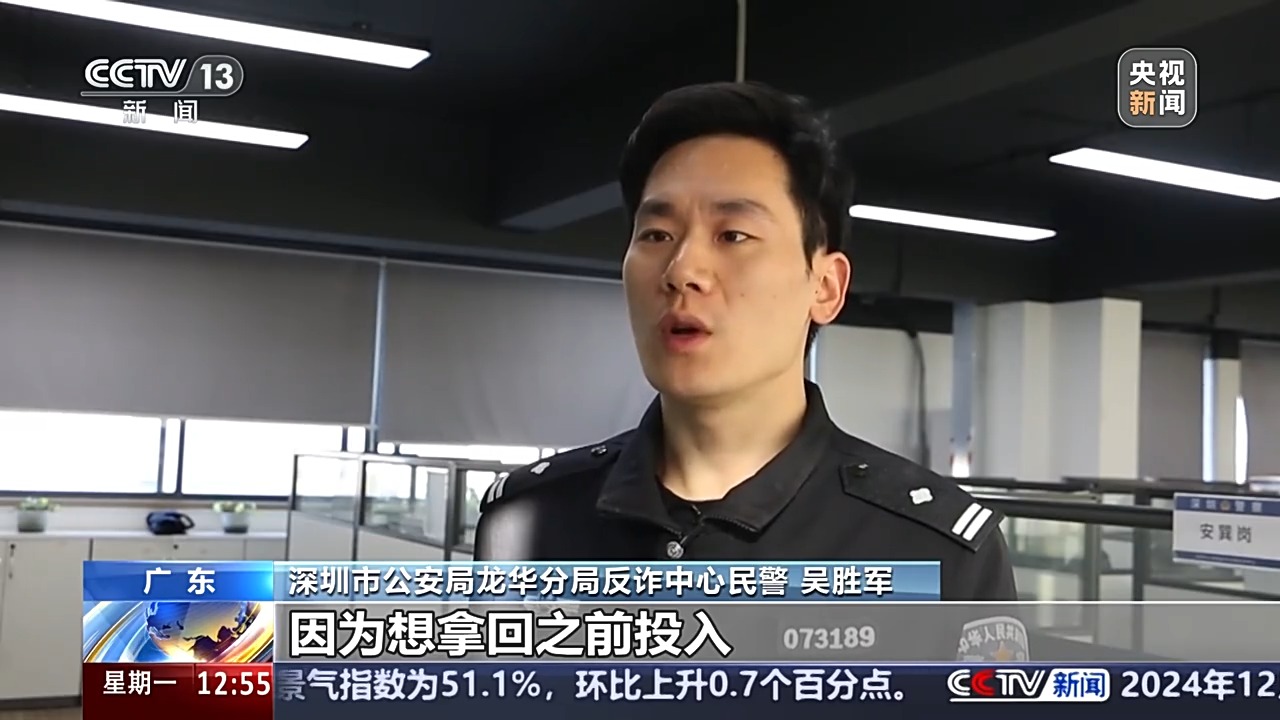 深圳市公安局龙华分局反诈中心民警吴胜军:事主通过支付宝扫码支付做任务被骗两万余元,因为想拿回之前投入,遂按照骗子指引在银行取现五万元,并准备跟车送往东莞。