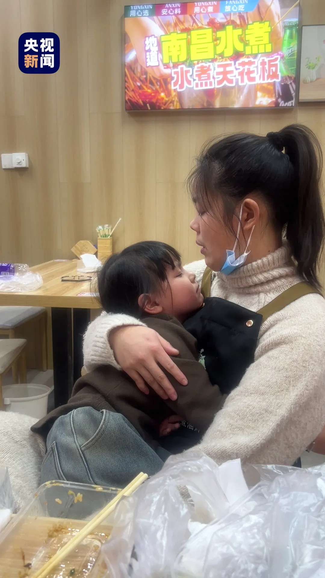 一开始,不满周岁的小朦就像小袋鼠一样,被佳欣兜在怀里送外卖,没有电梯,就一层层爬,下起雪,就把小朦裹得紧点,骑得慢点。偶尔更新一条状态,“打工好累,但是我不能哭,因为骑电动车时,擦眼泪不安全”。