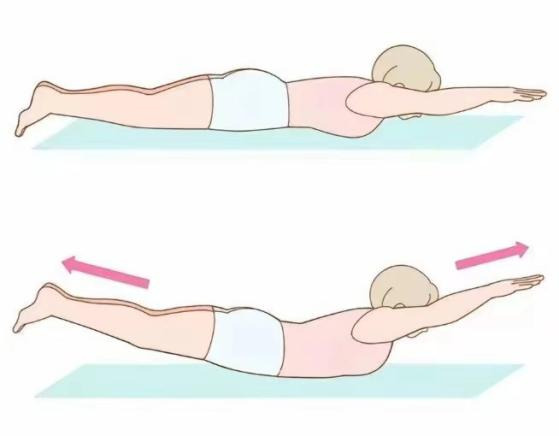 (2)飞燕式:练习者俯卧在床上,双手后伸或向前伸直,膝关节伸直。抬起身体,用力挺胸抬头,使头、胸及两上肢离开床面,同时两腿伸直向上抬起,离开床面。保持这个姿势3到5秒,然后放松肌肉,休息同样时间,完成一个周期。如图所示。