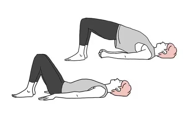 (1)五点支撑法:练习者需仰卧在床上,去枕屈膝,双肘部及背部顶住床面。此时,应确保两腿微开,与胯同宽,两膝曲起,脚心触地。双臂保持不动,收紧臀部内收尾骨。此时,锻炼者需要依靠双肩、双肘部和双脚这五点支撑起整个身体的重量,使腹部及臀部向上抬起,离开床面。此时,身体应呈拱桥状,胸部和腹部朝上舒展开来。初学者可以从每次做10—15次开始,逐渐增加到每次做20—30次。每天可以进行2—3组,每组之间休息30秒至1分钟。如图所示。