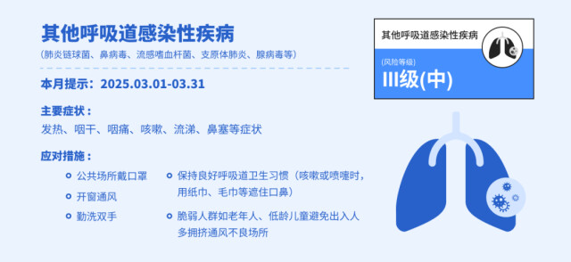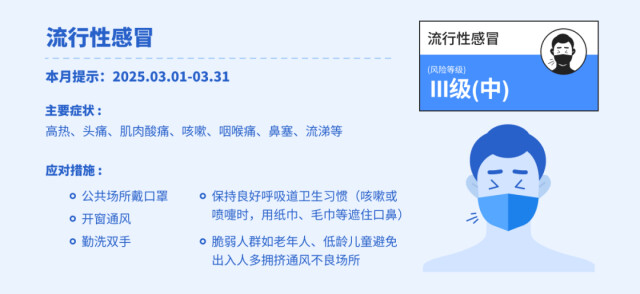 (全媒体记者 张春祥 通讯员 张亚娜 张恒娇)3月份哪些疾病风险高?今天,湖南省疾控中心发布我省今年3月疾病风险综合预报及防疫指数,指出需要重点关注流行性感冒、诺如病毒肠炎、其他呼吸道感染性疾病、新冠病毒感染。防疫指数:Ⅲ级(中)。