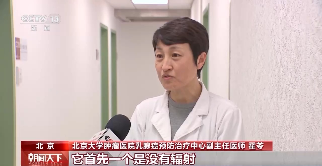 北京大学肿瘤医院乳腺癌预防治疗中心副主任医师霍苓:(超声检查)首先是没有辐射,然后安全性好,所以不同年龄阶段的女性,年轻女性孕妇,还有需要频繁检查的女性都是可以经常做的。钼靶是一个X线检查,它是有辐射的,做的时候会把病人的乳房整个夹成一个片状,所以病人的耐受程度也会差一点。
